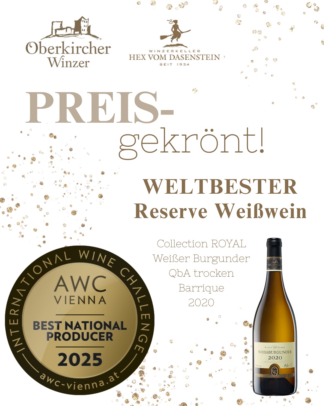 Seine Klasse wurde auch international gewürdigt: Der Jahrgang 2020 des Weißburgunder Royal wurde bei der AWC VIENNA – International Wine Challenge in Wien als „Bester Wein der Welt“ in der Kategorie Reserve-Weißweine ausgezeichnet. Ein Titel, der ihn in die erste Reihe der großen Weißburgunder einreiht – und der zeigt, dass unsere Weine weit über die Region hinaus für Furore sorgen.