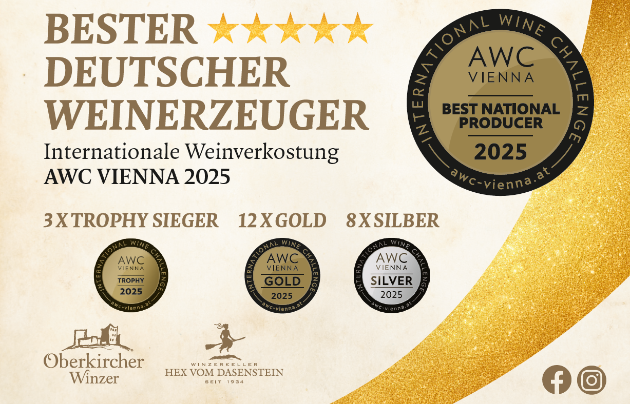AWC Vienna Best national producer of the year 2025 (Deutschland) 5 Sterne Weinbetrieb GOLD: 2023er Hex vom Dasenstein Muskateller Auslese - Gold --> Gewinner Kategorie Süßweine 2022er Hex vom Dasenstein Merlot QbA trocken - Barrique - Gold --> Gewinner Kategorie Merlot 2023er Hex vom Dasenstein Gewürztraminer Auslese - Barrique - Gold 2023er Hex vom Dasenstein Grauer Burgunder - Großes Gewächs Gewann Katzenbuckel - Gold 2022er Villa Heynburg Spätburgunder QbA trocken - Réserve - Gold 2023er Villa Heynburg Chardonnay - Gold SILBER: 2022er Hex vom Dasenstein Tempranillo QbA trocken - Barrique - Silber 2022er Hex vom Dasenstein Spätburgunder QbA trocken - Barrique - Silber 2022er Hex vom Dasenstein Onyx QbA trocken - Barrique - Silber 2023er Hex vom Dasenstein Riesling - Großes Gewächs Gewann Kappelberg - Silber 2023er Hex vom Dasenstein Weißer Burgunder Gewann Heidenhöfe - Silber 2022er Hex vom Dasenstein Spätburgunder Rotwein - Großes Gewächs Gewann Hundberg - Silber 2023er Villa Heynburg Grauer Burgunder QbA trocken - SilberMeiningers Deutscher Pinot-Preis 2023er Hex vom Dasenstein Weißer Burgunder QbA trocken - Großes Gewächs Heidenhöfe - 89 Punkte 2023er Villa Heynburg Weißer Burgunder QbA trocken - 90 Punkte